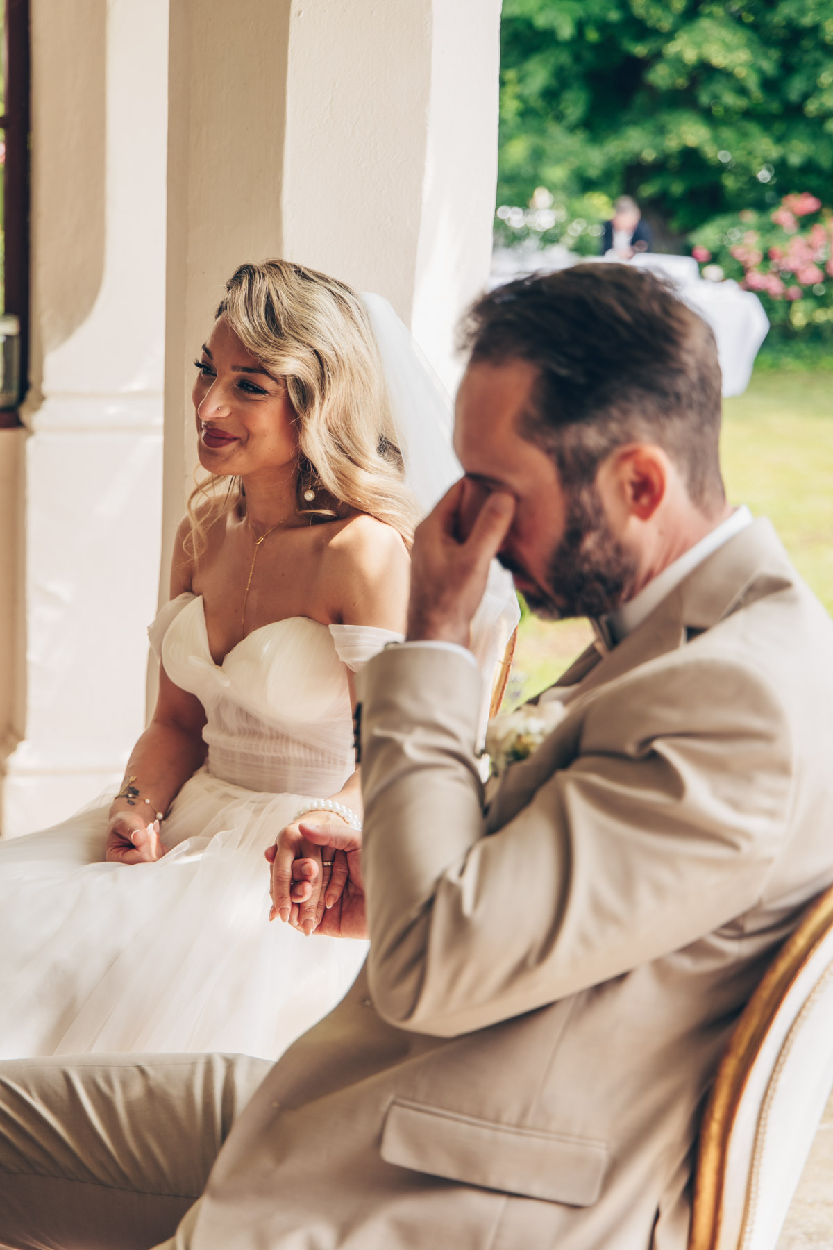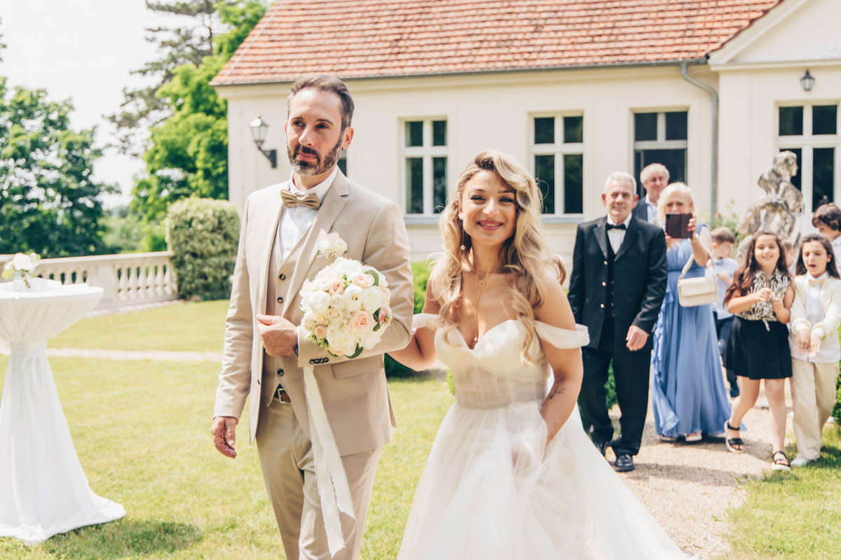 Der First Look folgte gleich nach dem Getting Ready bei der Trauung. Ihr könnt selber entscheiden, ob ihr das erste „Sehen“ vor der Trauung und ganz intim zu zweit zelebriert, oder es besonders episch mit euren Freunden und Familie teilt. Im Schloss RogĂ€sen habt ihr beide Möglichkeiten. Entweder der groĂe Auftritt auf dem Hinterhof oder auf der Vorderseite mit dem Blick auf die Hochzeitslocation.