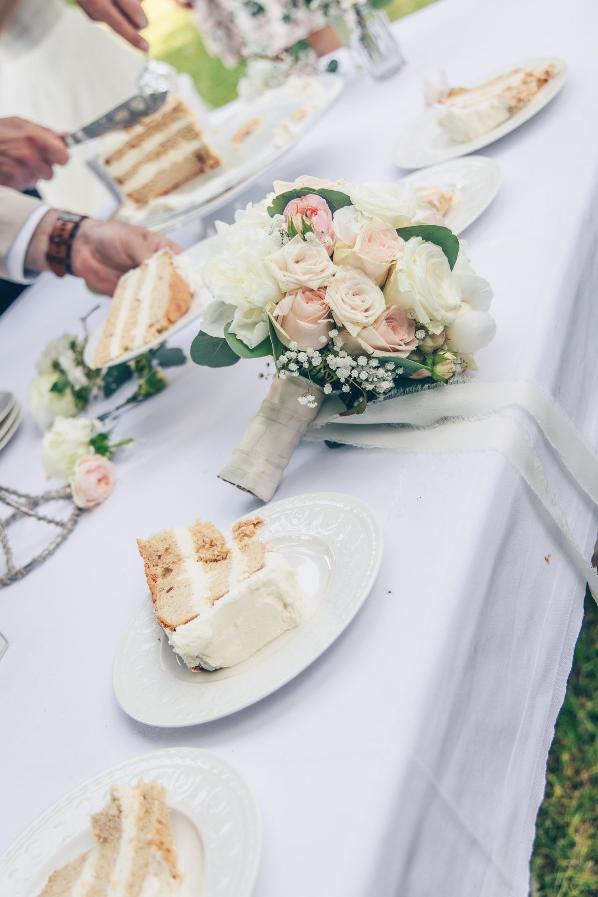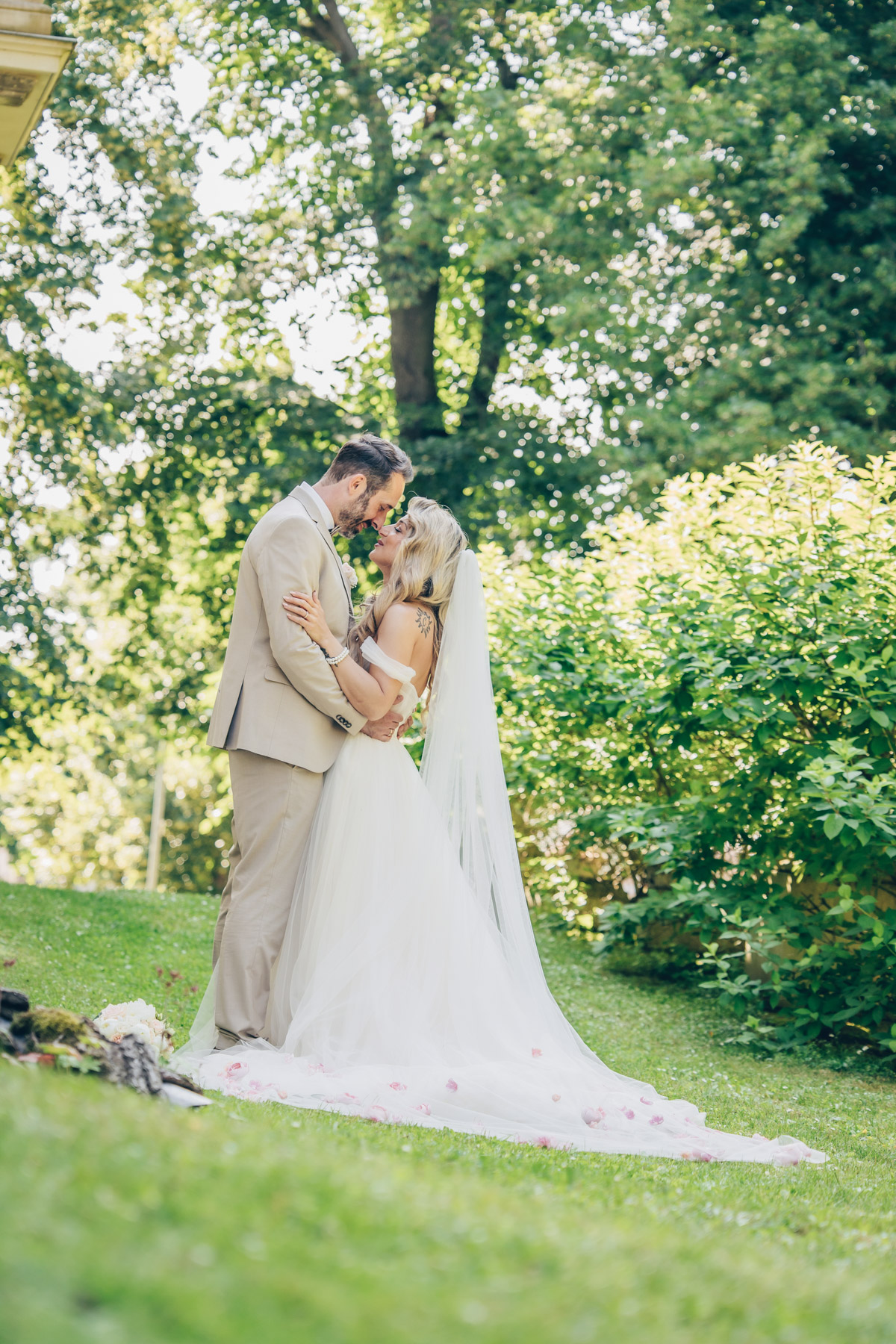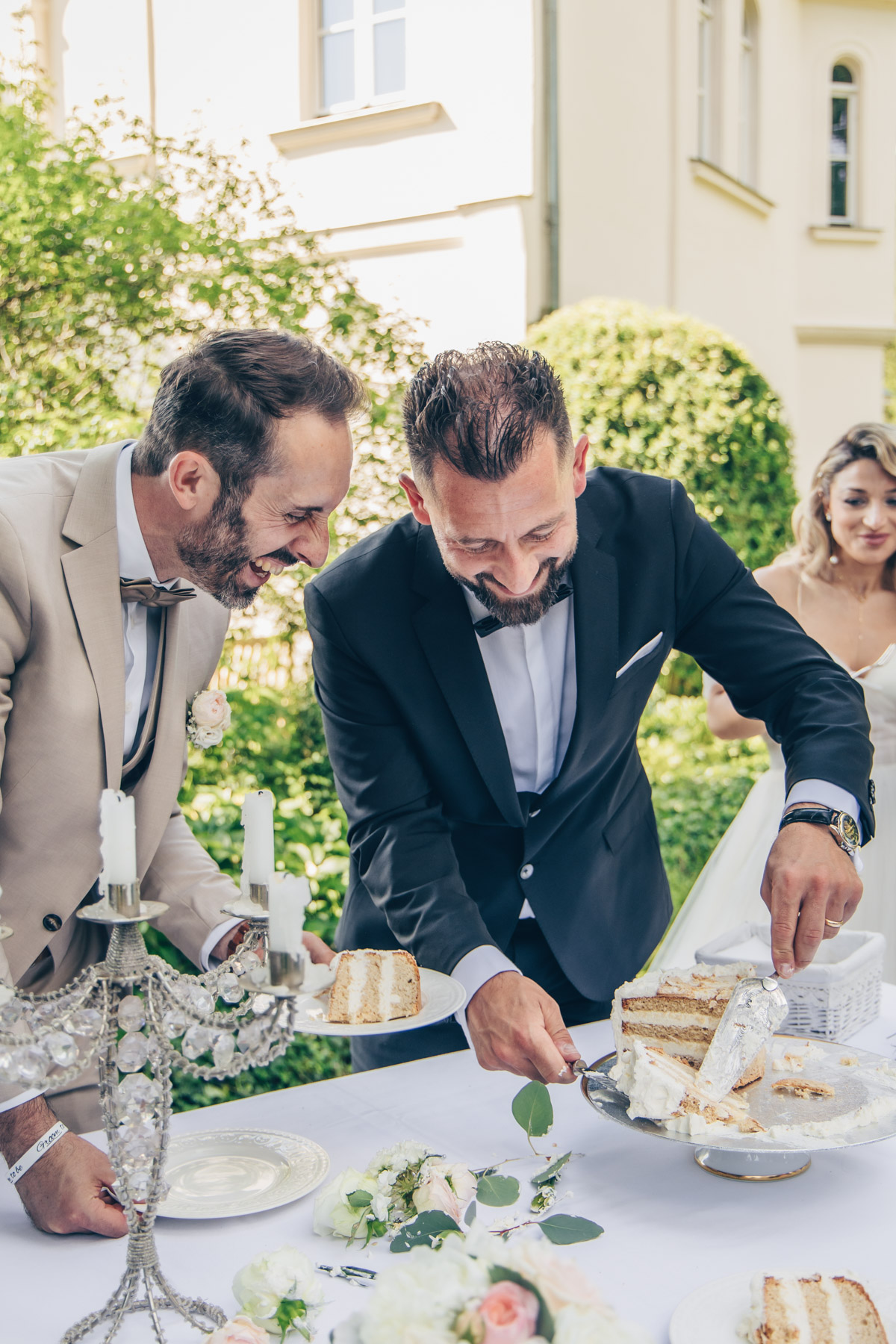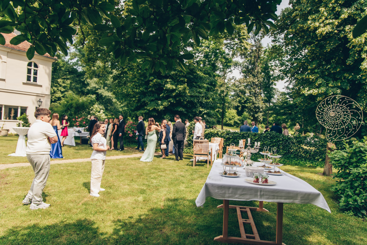 Hier haben die GĂ€ste und das Brautpaar die Möglichkeit, direkt nach der Zeremonie auf die weitlĂ€ufigen WiesenflĂ€chen zu treten und den Sektempfang drauĂen abzuhalten. Nach dem Sektempfang ging es direkt mit der Hochzeitstorte und den Anschnitt im freien weiter. Unter den groĂen BĂ€umen findet man gute schattige PlĂ€tze fĂŒr die GĂ€ste.